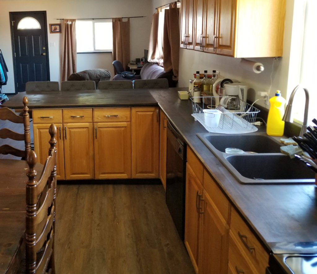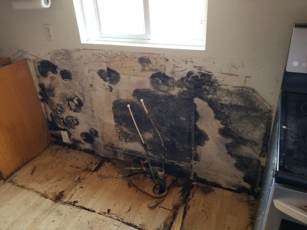 This customer had a slow water leak at the kitchen sink. Because it had been leaking for a while before it was noticed, the damage was substantial. Yes, that is mold on the drywall! The sink counter unit had to be completely rebuilt and the laminate flooring had to be replaced as well.