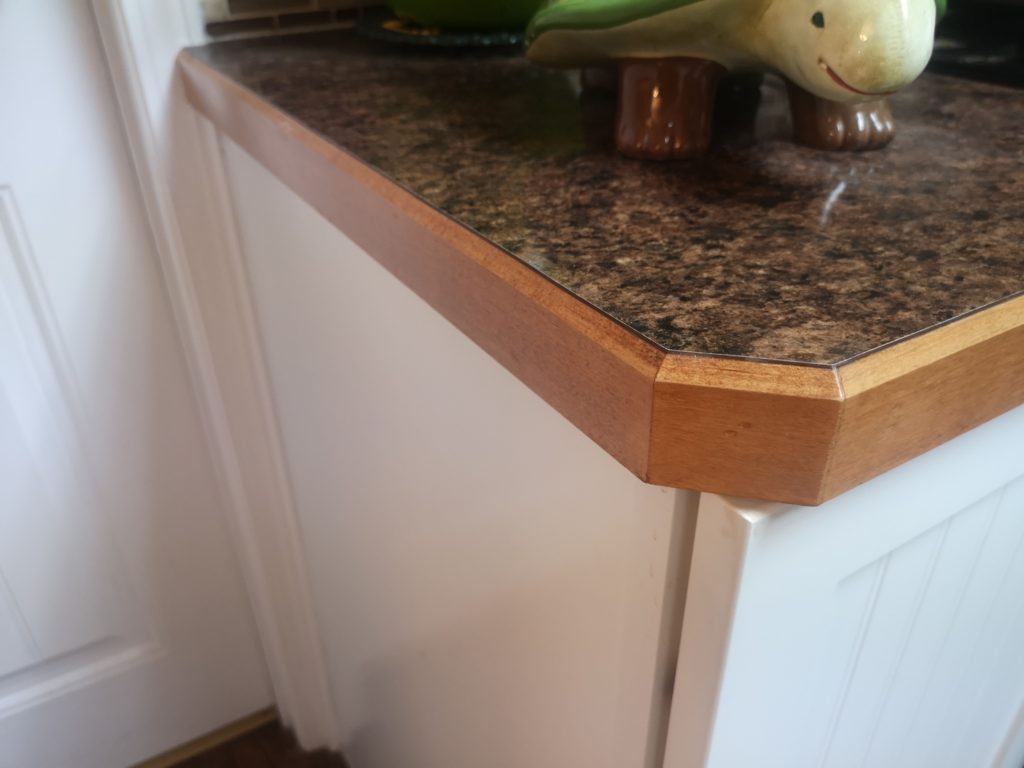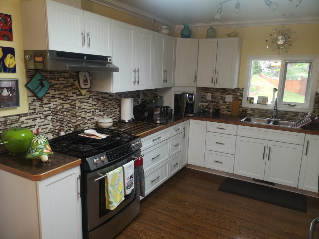 When the kitchen was finished it looked amazing! We were able to reuse the cabinet doors so no one would ever know that the sink cabinet unit is not the original. The butcher block countertops look so much better than the original Formica and pressure board countertops that were originally in this kitchen.
